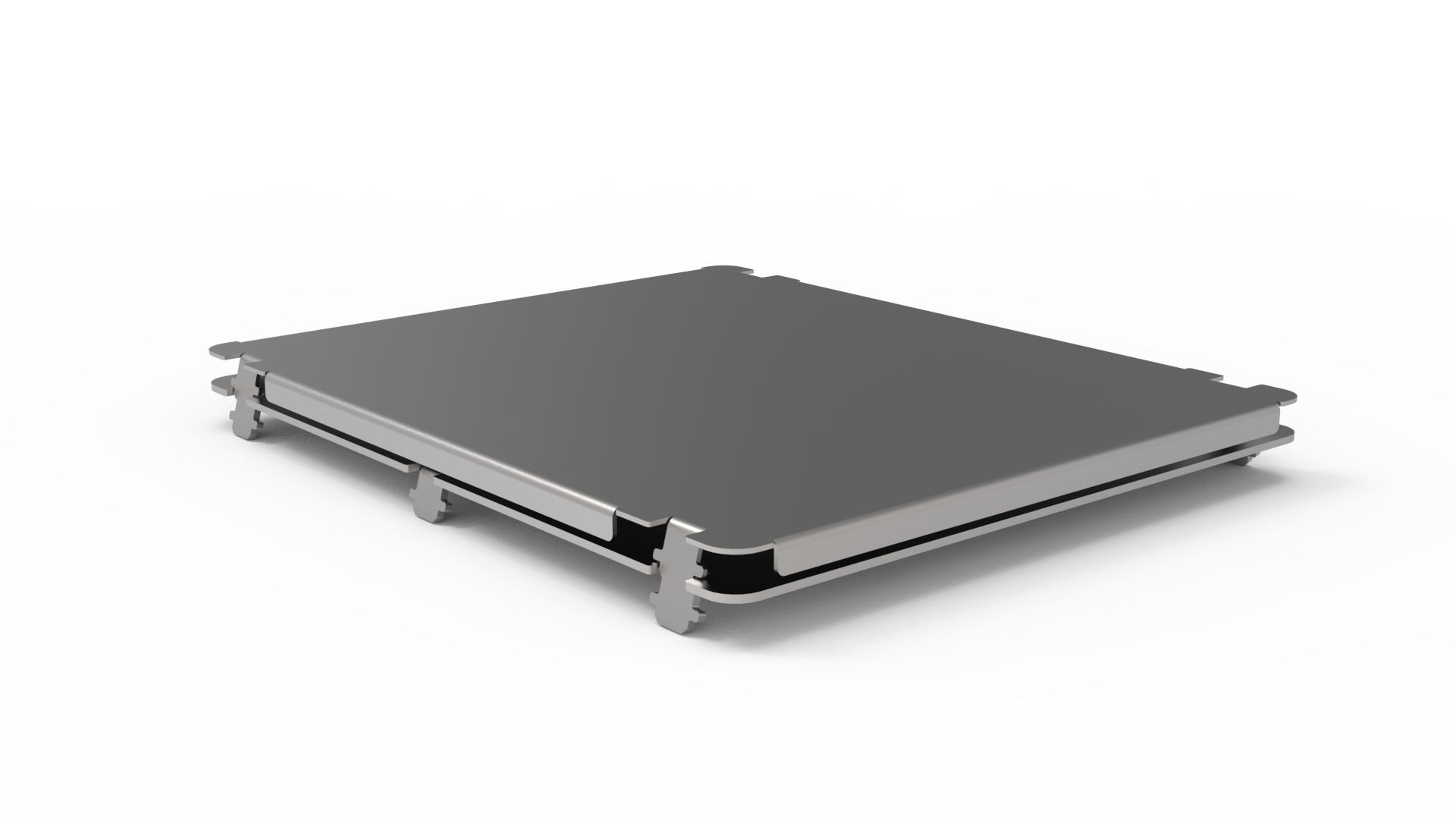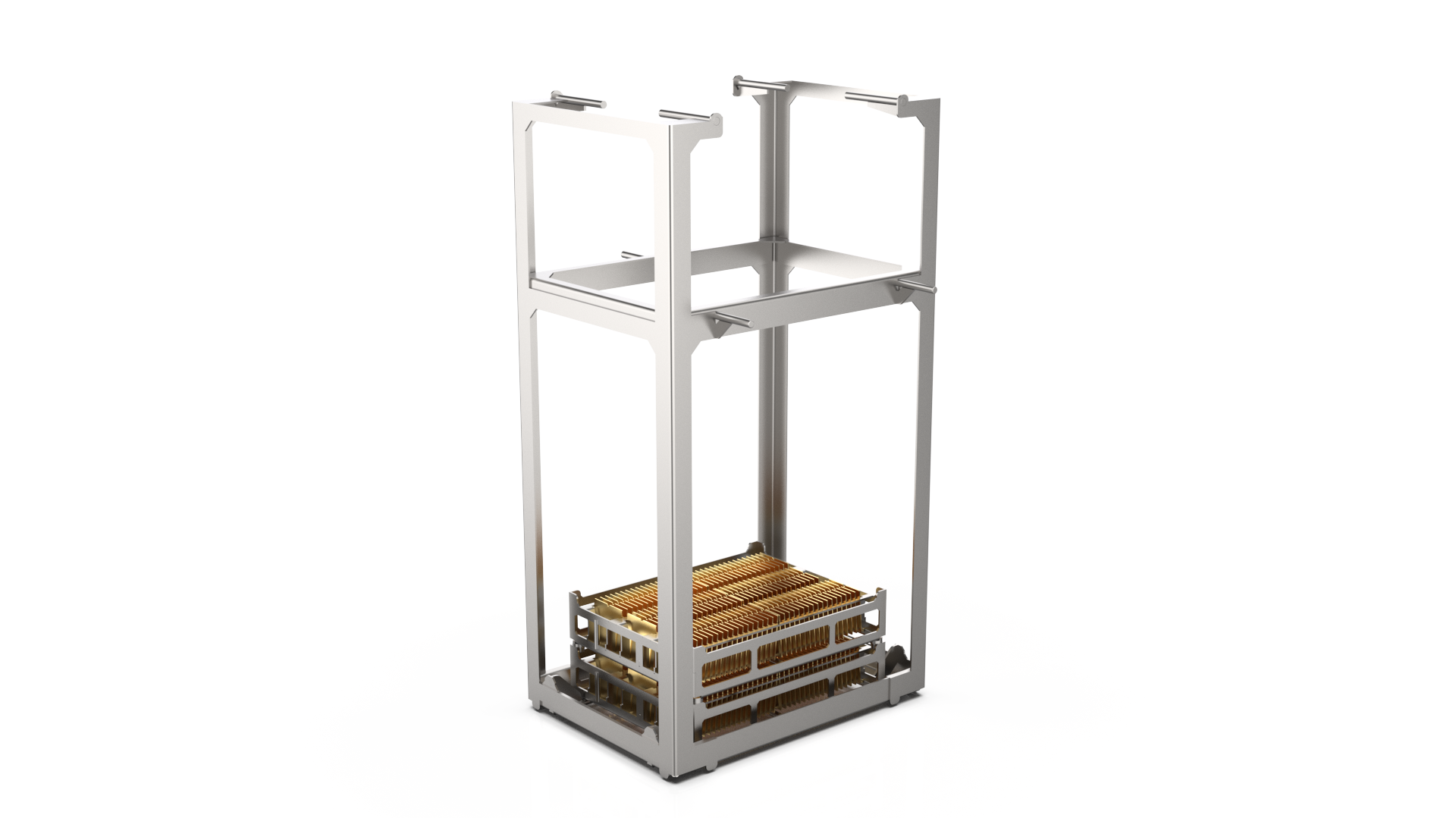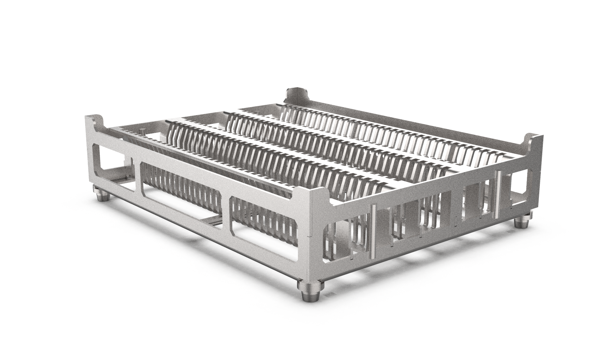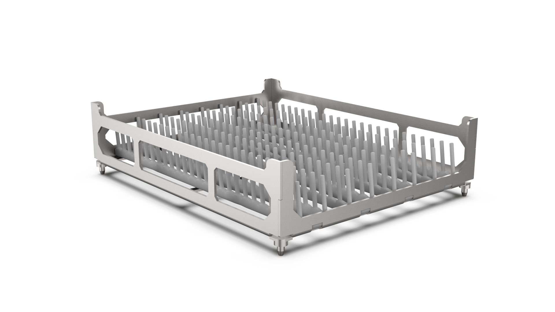 Panier de transport et lavage de pièces en acier inoxydable 1.4301, EP. 2mm, avec traitement électropoli et équipé des posages spécifiques en Nylon (PA12) interchangeables.